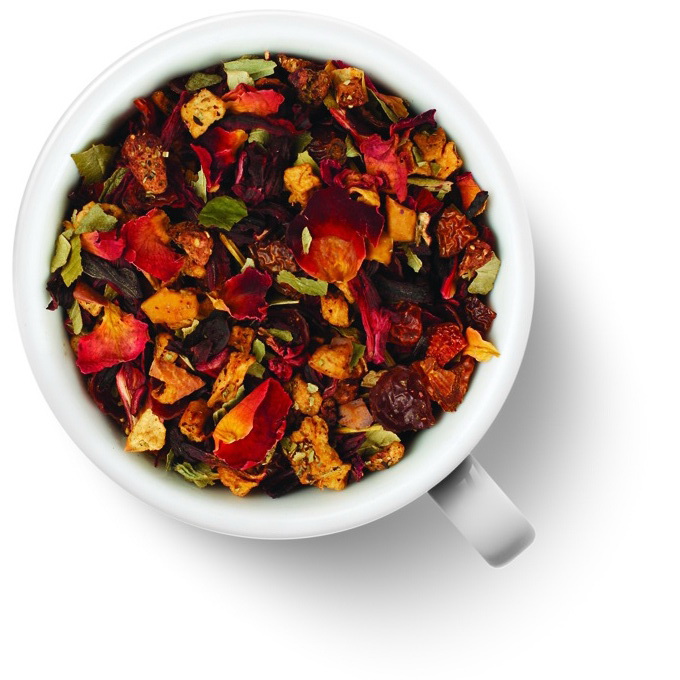 Чайный напиток. Состав: кусочки яблока, лепестки розы, листья земляники, шиповник, каркаде, клубника. Напиток ароматизирован натуральными маслами розы и клубники.